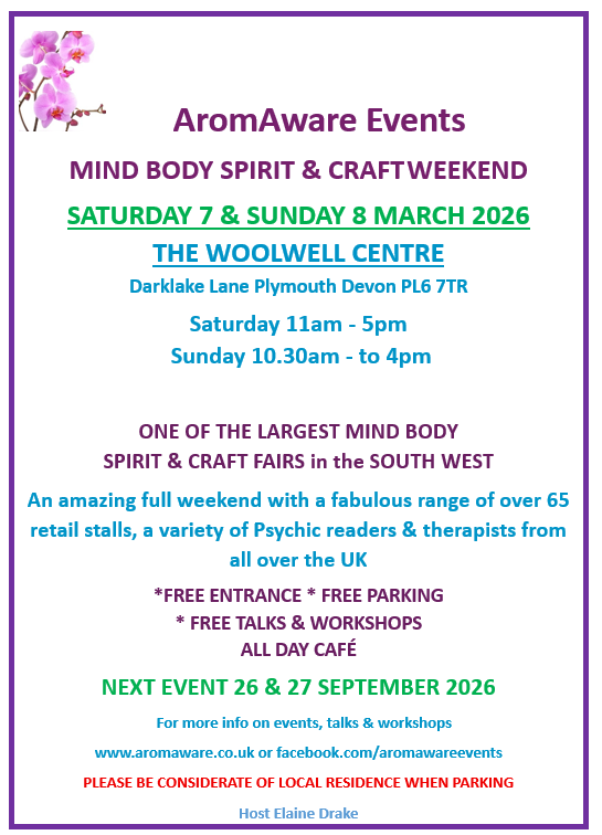 | This is the first event at The Woolwell Centre this year. Come & join us for an amazing Mind Body Spirit & Craft Weekend! Free entry, LOTS OF FREE talks & workshops, see our website for more info - www.aromaware.co.uk A fabulous range of wellbeing, holistic & craft stalls, therapists & psychic readers. NEW FOR MARCH - A HEALING AND THERAPY ROOM! Great food in the all day cafe including vegetarian & vegan food. A warm welcome awaits you all! Future event dates for next year are Saturday 26th & Sunday 27th September 2026 |
